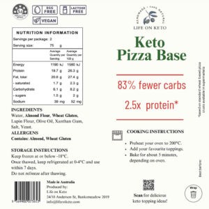 Ingredients: Water, Almond Flour, Wheat Gluten, Lupin Flour, Olive Oil, Xanthan Gum, Salt, Yeast.